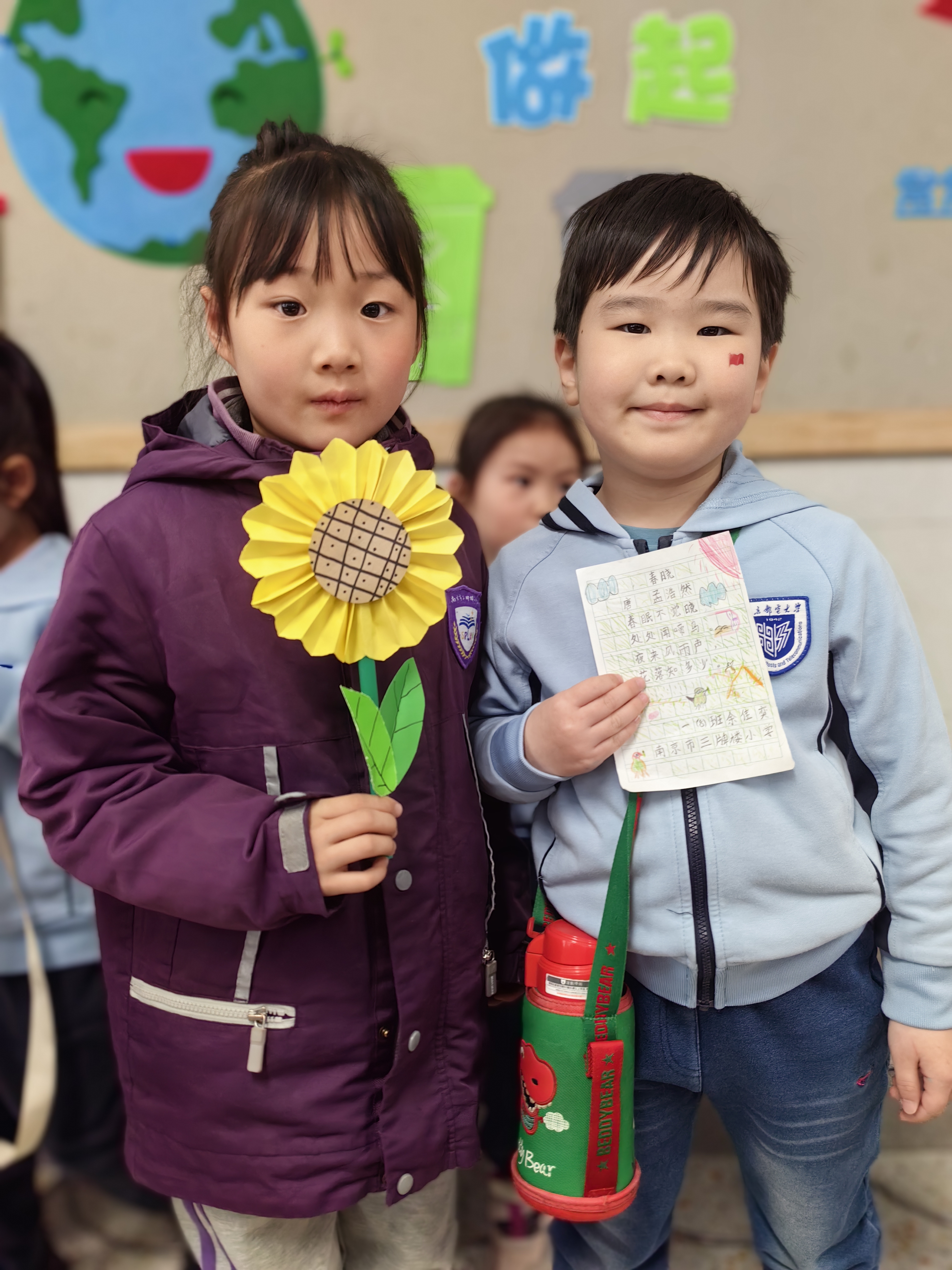 伴随着清脆的上课铃声,孩子们轻轻走进一年级教室,观摩小学生的课堂。哥哥姐姐们端正的坐姿、响亮的朗读声让他们不禁挺直了腰板;数学课上有趣的互动游戏更是引得他们跃跃欲试。上完课后,小朋友们为哥哥姐姐们送上了他们亲手制作的向日葵,祝福哥哥姐姐们学业有成。