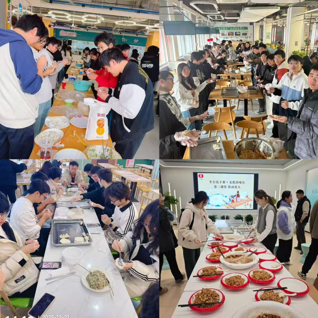 冬至作为中华民族的传统节日,蕴含着丰富的文化意义。本次包饺子活动意在通过亲身体验,让同学们感受传统文化的魅力,同时将劳动教育融入其中。活动当天,来自不同院系的同学积极报名参加,在欢声笑语中,将自己包好的饺子一同放入沸腾的锅中,待饺子浮起、呈现金黄透明状时,大家围坐在食堂的大圆桌旁,共同品尝自己亲手制作的美食。